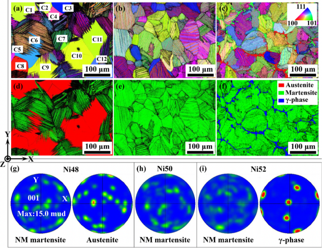 图2 . ( a ) - ( c ) EBSD晶体学取向图和( d ) - ( f )对应相图显示Ni48合金中奥氏体和NM马氏体共存,Ni50合金中纯NM马氏体和Ni52合金中NM马氏体和γ相共存。三种合金中奥氏体、马氏体或γ相的( g ) - ( i ) { 001 }散点数据极图。