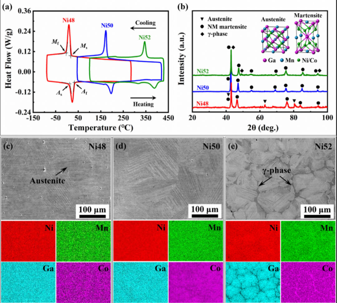 图1 . ( a ) Ni48 + xMn27Ga21-xCo4( x = 0 , 2 , 4)合金的升温和降温DSC曲线。( b )室温下测量的X射线衍射图谱,插图显示了立方L21奥氏体和非调制四方马氏体的晶体结构。( c ) Ni48、( d ) Ni50和( e ) Ni55合金中Ni、Mn、Ga和Co元素的背散射电子图像和相关元素分布图。
