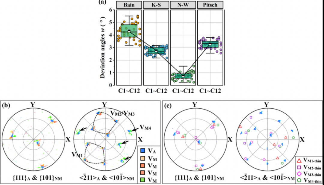 图5 . ( a ) 12个菌落计算的四种理论OR值与实验OR值偏差角的统计分布。( b )厚和( c )薄纳米层片中母相奥氏体和四种产物微变体的叠加极图。