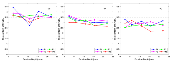 图3 不同盐浓度与腐蚀龄期下材料体系中硫元素含量的变化过程:(a) 0.5a;(b) 1.0a;(c) 1.5a