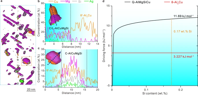 图2:峰值时效下当前合金的多种类型析出相和界面结构。a低倍HAADF - STEM图像。b上、下θ′/ Al界面均出现单个θ′- Al2Cu,c AgMg界面相。d θ′- Al2Cu与C界面相在共格界面处。e θ′- Al2Cu与L相在半共格界面处。f独立析出L。C相的晶胞结构和QSTEM模拟的HAADF - STEM图像已插入( d )中。插入图像中的强度线轮廓显示了不同界面层中Cu柱的强度变化。g,h通过APT检测到θ′/ Al界面处存在多个界面相和偏析层。