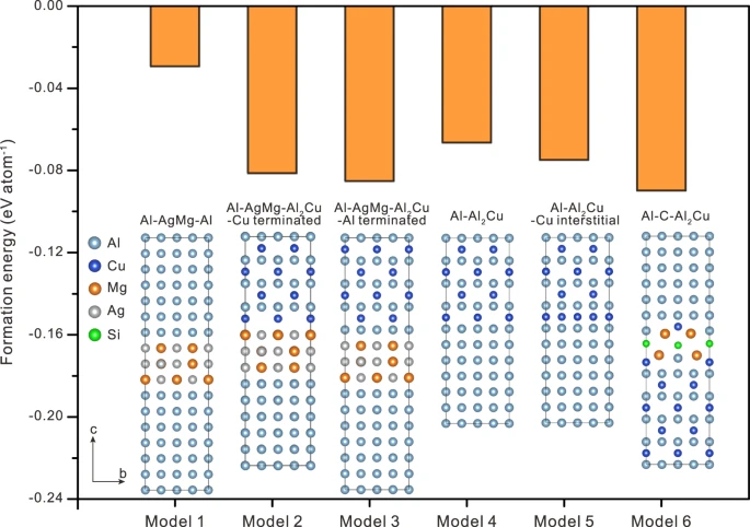 图6为不同界面结构的形成能。模型1为χ-AgMg相单独存在于Al中的组织,模型2和模型3分别为χ-AgMg相存在于Cu终止和Al终止的θ′/ Al界面中的组织。模型4和5分别表示不含Cu间隙原子和含Cu间隙原子的θ′/ Al界面结构。模型6为θ′/ Al界面存在C相的结构。