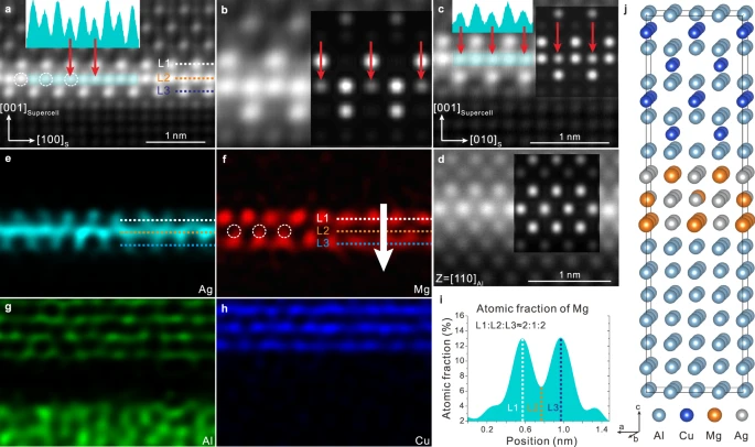 图3为新发现的χ - Ag Mg界面相的结构,a ~ c,d分别为χ - Ag Mg相沿[100] Al和[110] Al方向的原子分辨HAADF - STEM像,b为( a )的放大像,( a )所示区域的e - h原子分辨EDX元素图。在( b )和( c )中插入了χ - AgMg相中间层( L2 )的强度线剖面。i沿白色箭头的χ - AgMg相中Mg的浓度线剖面,积分宽度为7nm。j与χ - AgMg相的θ′/ Al界面结构的三维模型。值得注意的是,对于( a , b) ( j ),[100] ( c )和[110] ( d ),观察方向与超级单体的[010]方向平行。在( a )、( b )、( c )中插入利用所构建模型沿不同方向进行QSTEM模拟的HAADF - STEM图像。( f )中用白色虚圆标记的原子列与( a )中用白色虚圆标记的原子列相对应。