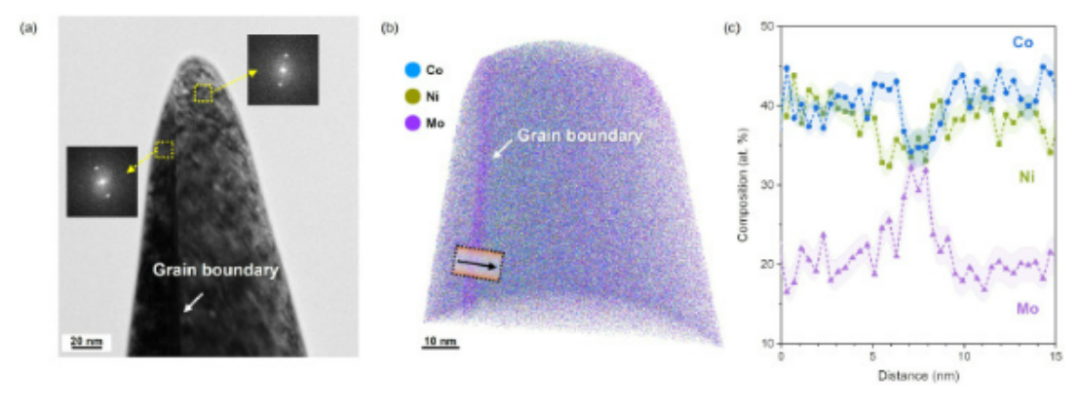 导读:具有面心立方(FCC)结构的复杂成分合金(CCAs)具有优异的力学性能,为结构材料合金设计引入了成分空间的扩展。通过配置各种过渡元素可以形成单一的固溶相,而掺杂少量其他元素通常也会形成脆性的金属间化合物。本文通过对单一FCC (CoNi)100-xMox合金的系统研究表明,广泛的耐火元素Mo可以在保持固溶体结构的同时提高强度和延展性。原子尺寸大于三维过渡元素的Mo的加入会导致FCC晶格出现严重的晶格畸变,并导致Mo原子富集的晶界偏析。此外,增加Mo含量可有效降低层错能(SFE)。随着Mo含量的增加,晶格畸变的增加增强了合金的固溶强化。此外,随着SFE的降低和晶界偏析对位错部位的稳定,这种提高的固溶强化增加了晶界强化,达到了1 GPa的屈服强度。此外,随着Mo的增加,SFE的降低导致位错子结构的转变和变形孪晶的细化,从而增强了应变硬化能力,从而提高了~ 1.3 GPa的抗拉强度和~ 50%的塑性。耐火元素Mo的这种综合和协同作用使单一FCC固溶体的复杂成分合金克服了强度和延性的权衡。