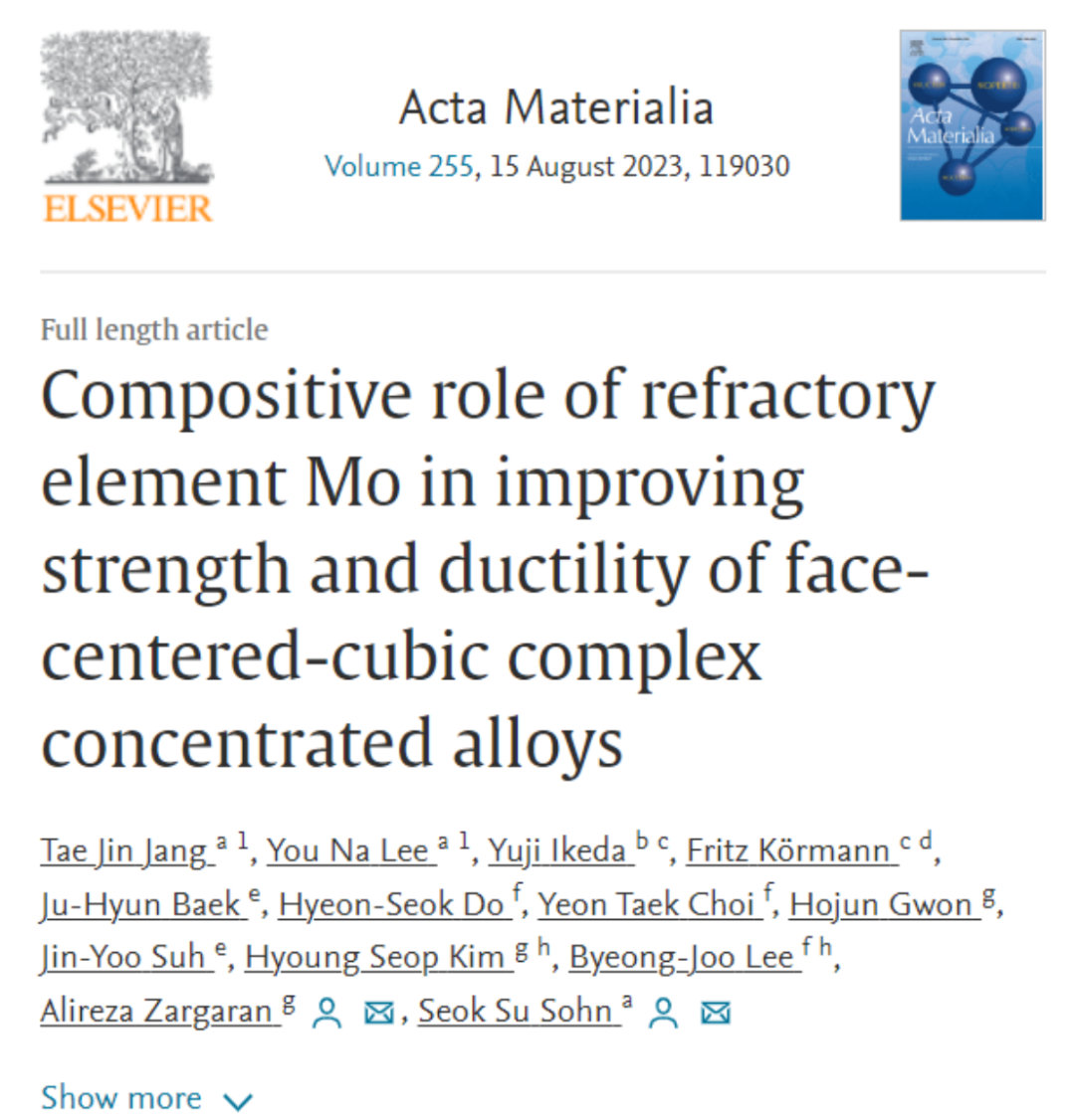 韩国高丽大学Seok Su Sohn教授团队的这项研究成果以题为“Compositive role of refractory element Mo in improving strength and ductility of face-centered-cubic complex concentrated alloys”发表在国际期刊Acta Materialia上。
