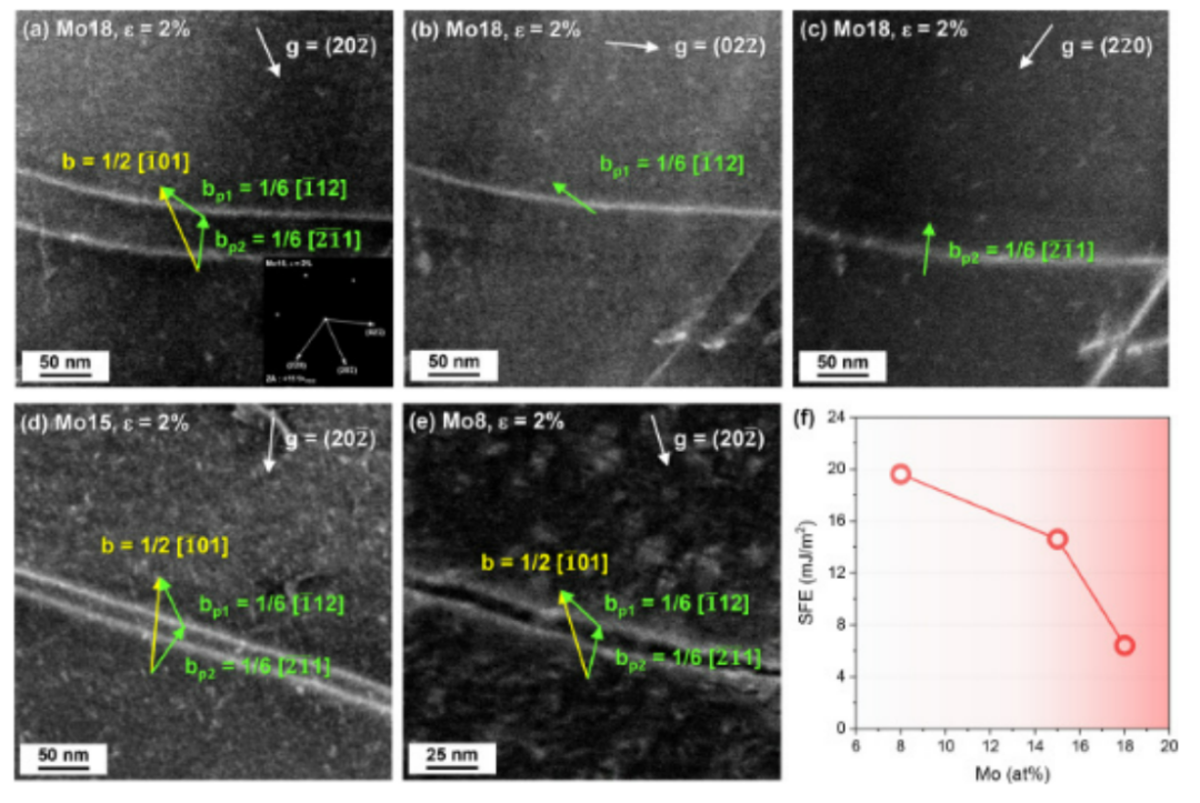 图11所示。Mo8、Mo15和Mo18合金在2%工程应变下变形的位错分析和SFE测量。