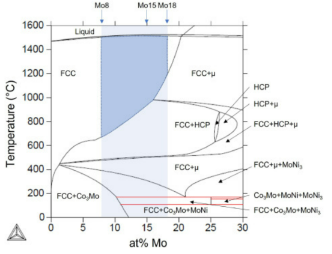 图1所示。(CoNi)100-xMox合金体系(x = 0-30 at%)在0-1600℃温度范围内的平衡伪二元相图。组成范围从(CoNi)92Mo8到(CoNi)82Mo18以蓝色突出显示。