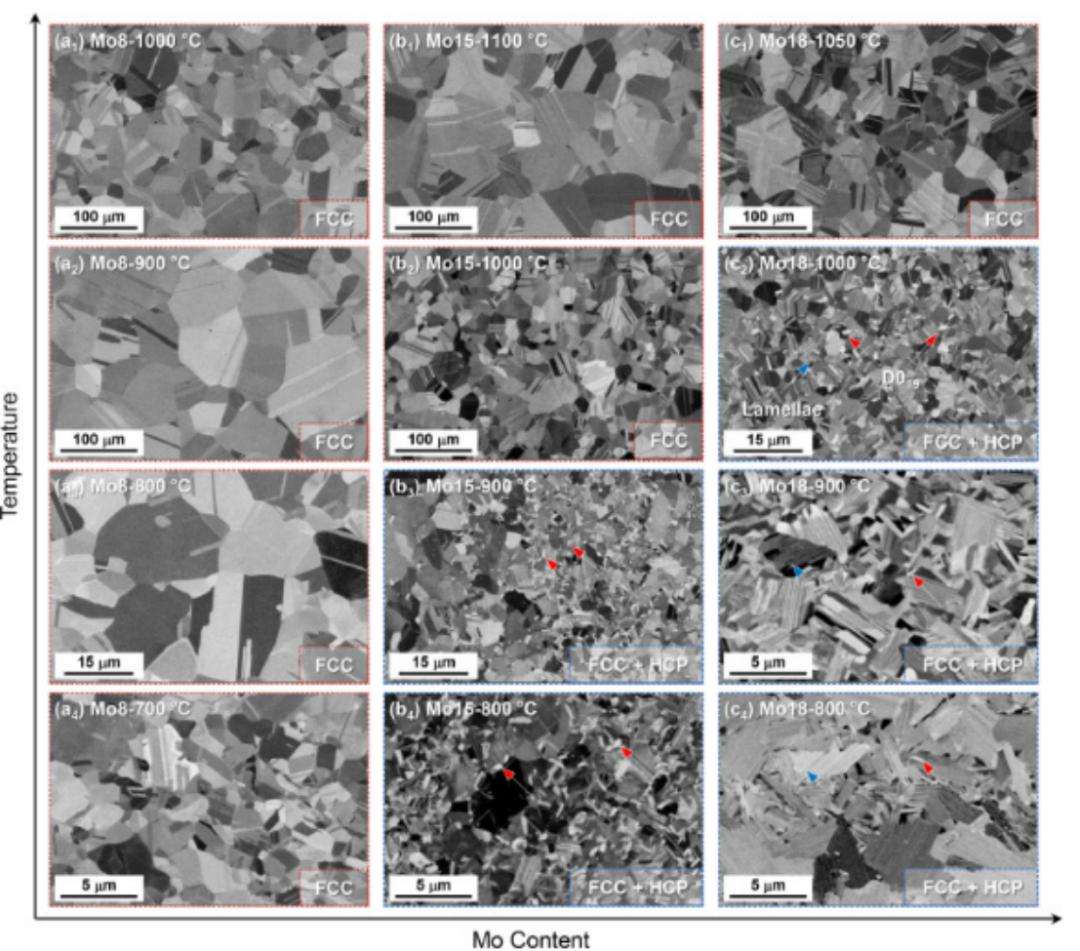 图3所示。(a1-a4) Mo8、(b1-b4) Mo15和(c1-c4) Mo18合金在不同温度下退火1h后的BSE图像。FCC固溶体单相和FCC- hcp双相试样分别用红点和蓝虚线框表示。
