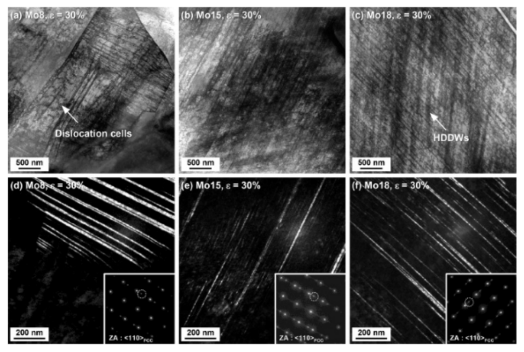 在拉伸变形过程中,较高的Mo含量导致较高的应变硬化率,从而提高了强度和塑性。随着Mo含量的增加,SFE的降低导致位错亚结构由DC向HDDW转变,孪晶亚结构细化。位错和孪晶亚结构的转变都显著地阻碍了位错滑动,并产生了更高的应变硬化能力。