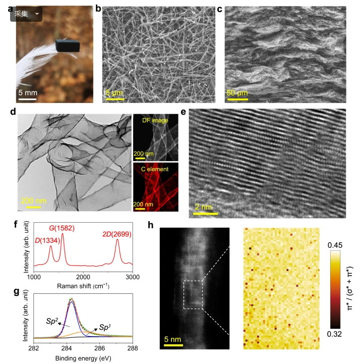 近日,西安交通大学材料学院王红洁教授课题组以前期研发的硅基陶瓷气凝胶为模板,将牺牲模板法和化学气相沉积法相结合,研发出了一种由sp2-sp3杂化的柔性碳管组成的、具有高度交联互锁的均匀三维网络结构的层状碳气凝胶。该气凝胶中高度交联互锁的三维网络结构赋予了材料优异的协同变形能力,可有效避免在压缩过程中局部应力集中所导致的结构性破坏;而碳管中局部存在的sp3键则可在一定程度上抑制管壁间由于弱范德华键所造成的相对滑移,进而提高管状结构的稳定性及刚度。因此,该气凝胶材料(密度仅为~12-40 mg/cm3)不仅保持了优异的压缩回弹性(99%压缩应变完全可回弹),还获得了高承载能力(最大压缩应力高于20MPa),以及抗疲劳特性(99%应变循环1000次永久变形小于1.5%),同时还具有超高的耐温特性(2500℃惰性气氛)。这些综合性能使其具备了在极端环境下的应用价值。