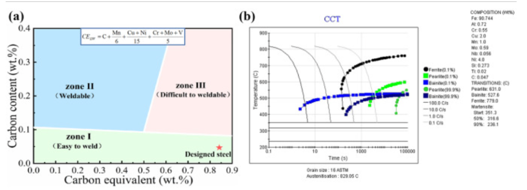 图1. 试验钢的重力焊性评价图及CCT曲线。(a)重力焊性评价图;(b) JMatPro®数据库计算的CCT曲线。