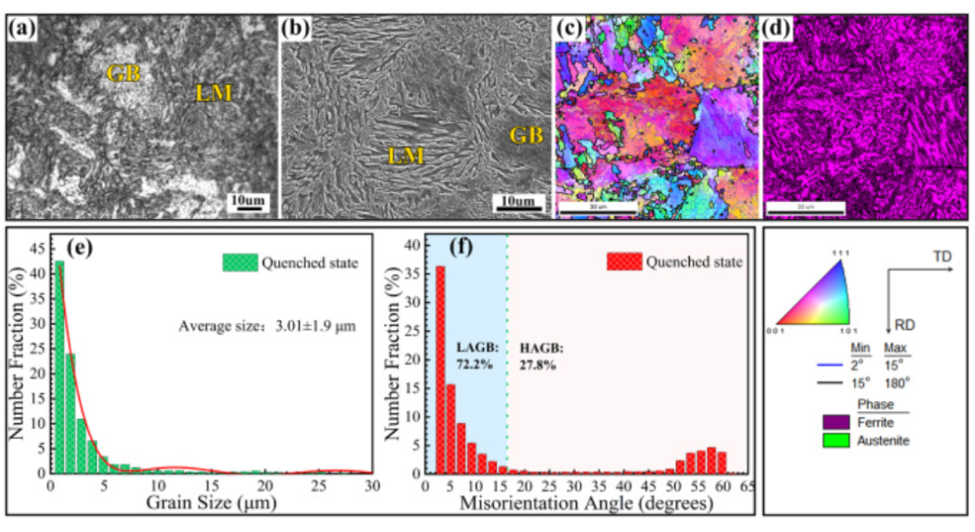 图5.实验钢在淬火状态下的组织特征。(a) OM、(b) SEM、(c)叠加晶界取向图(黑线为15 ~ 180°的高角度晶界,蓝线为2 ~ 15°的低角度晶界)和(d)相图为典型板条马氏体和粒状贝氏体特征。(e)晶粒尺寸分布;(f)根据EBSD结果计算的取向偏差角。