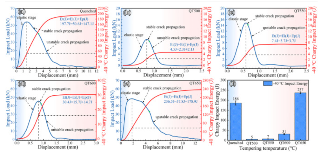 图3. 在-40℃下,不同热处理试样具有代表性的冲击载荷和能量随位移的变化曲线。(a)淬火状态,(b) QT500钢,(c) QT550钢,(d) QT600钢,(e) QT650钢,(f)三个试样对应的平均冲击能。