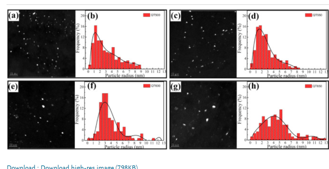 图10. (a、b) QT500钢、(c、d) QT550钢、(e、f) QT600钢和(g、h) QT650钢样品的析出相TEM暗场显微图及析出相尺寸分布。
