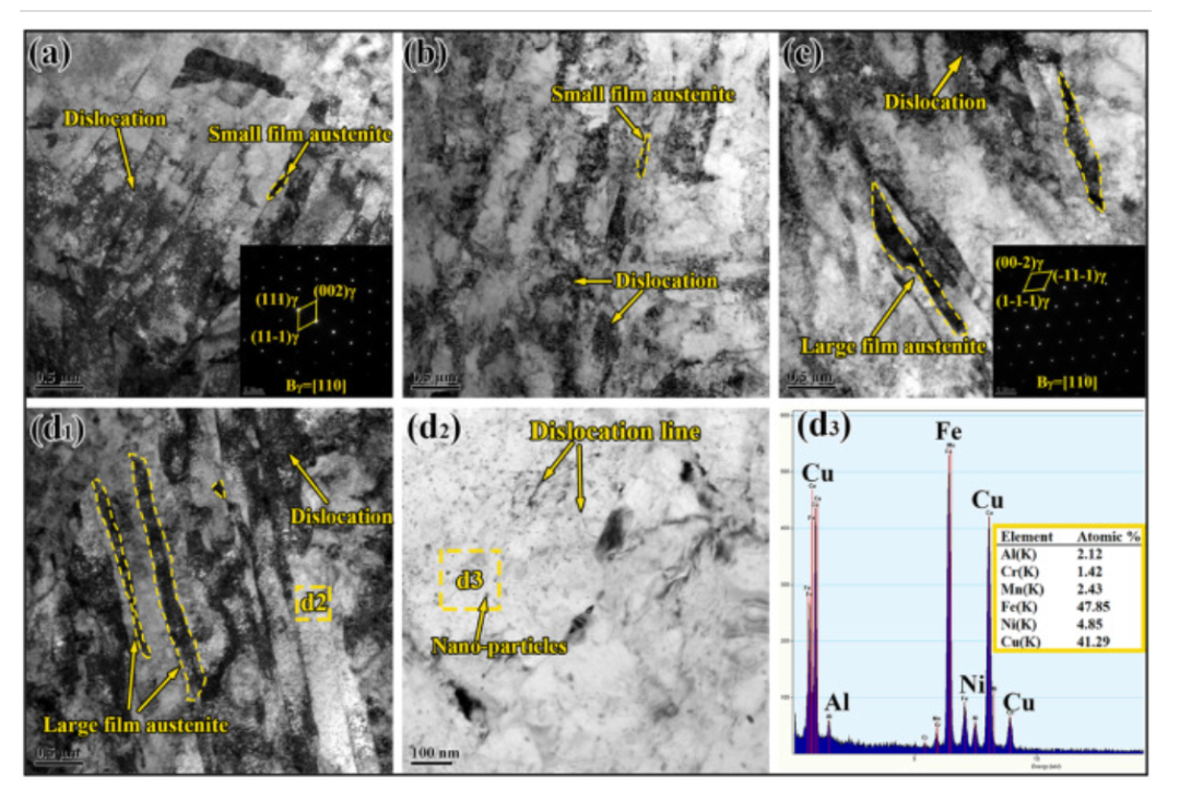 此外,超高强度钢很难平衡低温冲击韧性和高强度。对于传统的超高强度马氏体钢,高碳含量有助于提高强度,但会导致回火脆性和夹杂物,导致低温冲击韧性低。低碳共析出超高压钢有望通过控制微观组织实现强度与韧性的结合。Zhao等通过控制轧制工艺获得了屈服强度为890 MPa、冲击能为213 J的低碳共析出超高压钢。近年来,引入稳定的纳米奥氏体,通过相变诱导塑性(TRIP)提高低温冲击韧性已成为研究热点。Li等人通过调质-配分-回火工艺控制奥氏体还原和纳米析出,获得了屈服强度为921 MPa、室温冲击韧性为130.7 J的低碳共析出超高压钢。