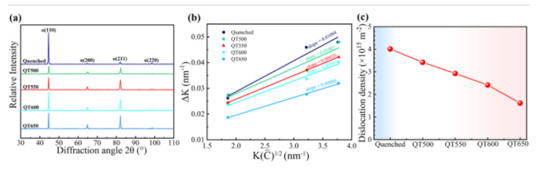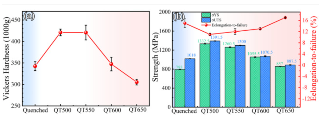 设计的UHSSTS在不同状态下的硬度如图2a所示。所设计的试验钢淬火后硬度为343 HV。随后,在500℃时效处理60 min后,被试钢的硬度显著提高,达到峰值421 HV,证实了显著的沉淀硬化效果。试验钢的硬度在550℃时效后保持在峰值,随着时效温度升高至600℃,硬度显著下降至348 HV。直至时效温度达到650℃,硬度降至最低306hv。硬度的演变表明,在500 ~ 550℃的时效峰值温度下,大量纳米颗粒的析出导致了时效硬化,当时效温度超过峰值温度时,硬化效果明显下降。