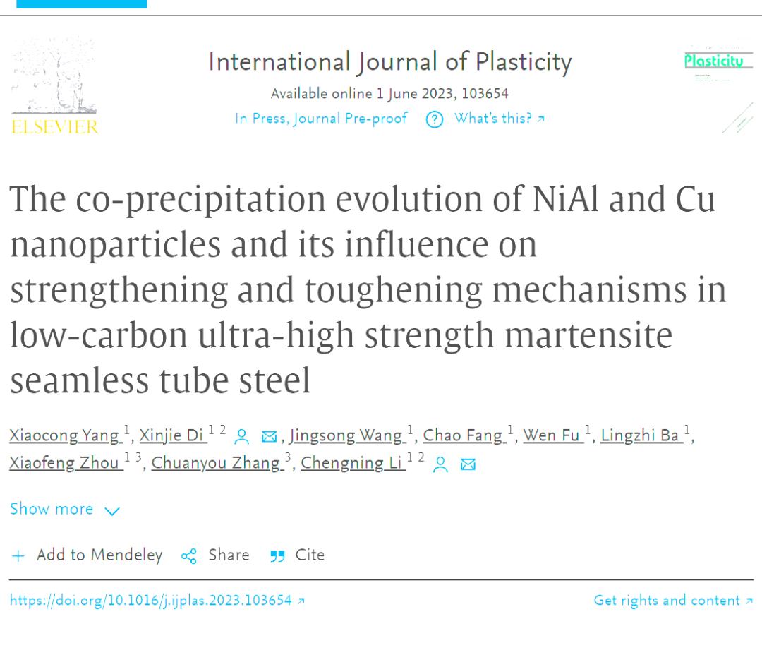 相关研究成果以题为The co-precipitation evolution of NiAl and Cu nanoparticles and its influence on strengthening and toughening mechanisms in low-carbon ultra-high strength martensite seamless tube steel发表在International Journal of Plasticity期刊上