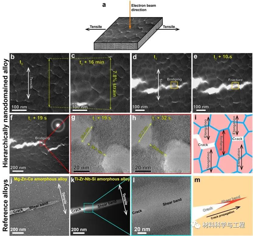 图 5 多级纳米化学异质非晶合金的原位TEM拉伸变形行为。b–f 多级纳米化学异质非晶合金在拉伸时的明场TEM图。 g-h (f) 中红色虚线框区域的放大HRTEM图。i 多级纳米化学异质非晶态合金在拉伸过程中的变形示意图。显示了在裂纹产生前材料发生均匀塑性变形,裂纹产生后均匀塑性流变区桥连裂纹,从而减缓裂纹扩展。 j–l 参照组Mg-Zn-Ca和Ti-Zr-Nb-Si非晶态合金在拉伸过程中的明场TEM 图。m 参照组非晶态合金在拉伸过程中的变形示意图,显示了裂纹由剪切带区域快速扩展。