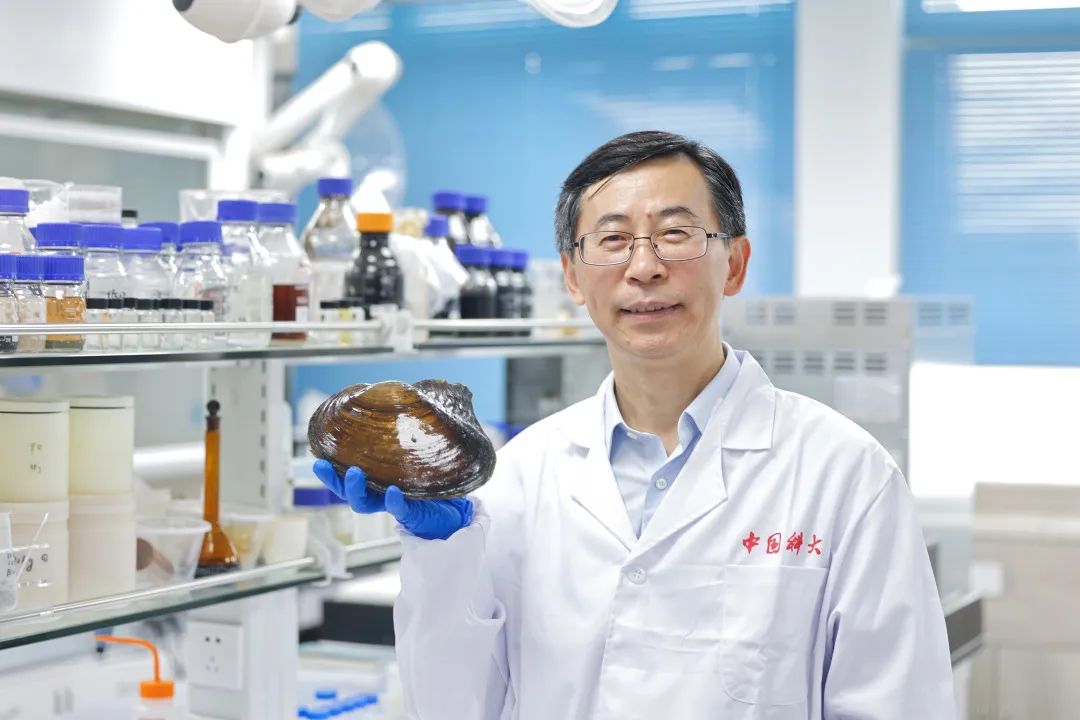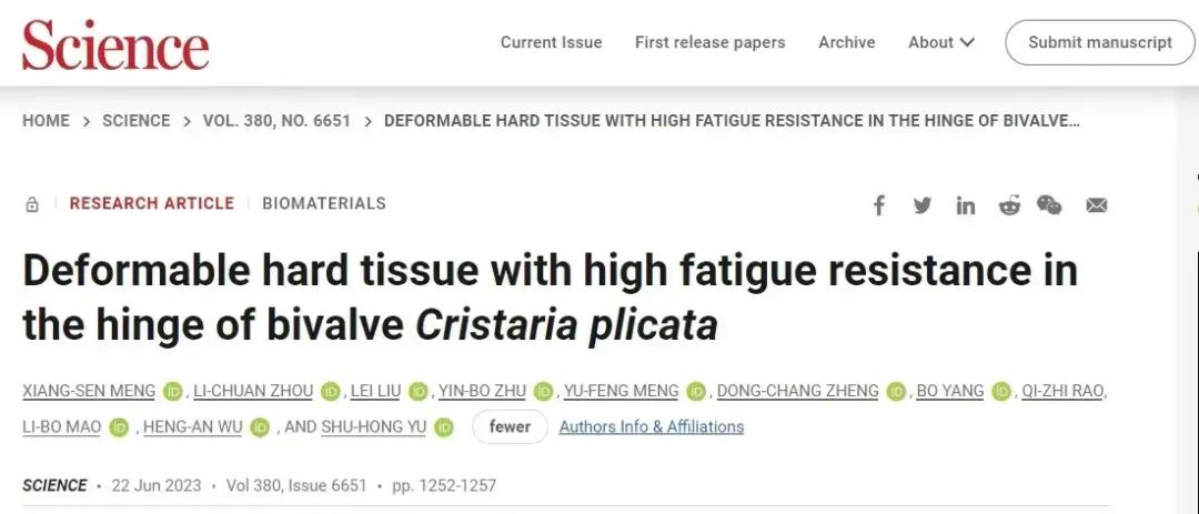 鸡冠蚌“铰链”为新型柔性耐疲劳材料设计提供新思路 中国科学技术大学俞书宏院士团队联合吴恒安教授团队成功揭示了双壳纲褶纹冠蚌铰链内的可变形生物矿物硬组织的耐疲劳机制,提出了一种多尺度结构设计与成分固有特性相结合的耐疲劳新策略,为未来耐疲劳结构材料的合理设计和制备提供了新的见解。 研究成果以“Deformable hard tissue with high fatigue resistance in the hinge of bivalve Cristaria plicata”为题,于6月23日发表在国际学术期刊《Science》上。 论文链接: https://www.science.org/doi/10.1126/science.ade2038 有所发现、有所发明、有所创造 为什么要研究普普通通的河蚌呢? “我们要向自然学习”,俞书宏院士坚定地说,“通过解析自然材料,特别是生命体所创造的具有复杂结构的生物材料,搞清楚包括它的组成、结构与功能之间的关系,用于指导我们在仿生领域开展更多的探索研究。”正是因为俞书宏院士提出的独特研究思路和视角,他获得了新基石科学基金会的资助,入选首批新基石研究员。 俞书宏院士及其团队早在2016年,就模仿双壳纲软体动物合成天然珍珠母的“砌墙式”策略,提出一种新的“组装与矿化”联用的介观组装合成方法,从源头模仿天然贝壳珍珠层的形成过程和化学组分,在国际上首次成功矿化合成了人工珍珠母材料,相比于天然珍珠母长达数月的形成周期,人工珍珠母合成只需要两周左右的时间,相关研究成果发表在《Science》上。俞书宏院士表示,通过对生物材料微观结构的细致观察和深入研究,可以发现多级有序结构对材料宏观性能的提升能起到至关重要的作用。 “有所发现”、“有所发明”、“有所创造”,俞书宏院士用这三个词总结了团队的期待和目标,“这是我们仿生材料研究团队的科研理念。首先是有所发现,要学会发现自然界神奇的生物材料的特殊性质,通过解析天然材料结构与功能的关系,能够帮助我们明晰新材料的创制与设计理念,接着要有所发明,将提取的设计原理用于仿生材料的制备合成,最后有所创造,通过将从自然材料结构解析中获得的材料结构设计理念交叉融合,力求创制出全新的人工材料,并将研究成果应用到实际材料的创制中,以提升材料性能”。 此外,在仿生材料研究领域,除了需要懂得化学材料相关知识,也需要对生物学、力学、数学方面的知识有所掌握。这也是研究的难点之一,要求研究人员具有很强的学科交叉能力。俞书宏院士说,“天然材料,特别是生物材料,它的结构非常复杂。在研究的时候需要我们具有跨学科的知识储备。”俞书宏院士也经常指导刚进入实验室的同学,鼓励同学们在仿生材料领域发现自己感兴趣的方向并开展研究工作。 俞书宏院士表示,“我们有信心创制一系列的仿生新材料,把传统材料的性能提升至更高水平。” 十年如一的科研坚守 “人工材料难在制备,自然材料难在解析”,茅瓅波副研究员说,“从自然界获得的天然生物材料,它们不仅组成未知,而且其结构设计是从宏观尺度直达分子尺度。想要把如此复杂的材料结构以及性能之间的联系说清楚,十分具有挑战性。” 这项研究持续了十余年,从2013年就已经在俞书宏院士的指导下开始进行。2015年茅瓅波副研究员从他的师兄刘蕾那里接过这项工作,继续开展河蚌铰链的解析,但一直认为没有达到俞书宏院士期望的完成度。2017年,茅瓅波副研究员博士毕业后,和同年入学的师弟孟祥森开始合作继续推进这一研究工作,没想到一做又是六年。在长达近十年的研究工作中,是俞书宏院士对基础科学长期研究的坚守和信心,为工作的开展提供了最好的条件和保障,这也与他一贯提倡的“甘于坐冷板凳”和“勇于做从0到1的科研”的科研理念高度一致,正是俞书宏院士对科研方向的远见、传承和坚持,最终才能够取得又一突破性的成果。 在研究过程中,团队也遇到了非常多的困难。 十年前测试仪器很难实现对于材料精细结构表征的要求,直到近些年国家和学校在这方面的投入加大,给了研究团队更好的平台条件去达到想要实现的目标。在研究铰链微观结构过程中,需要分析材料各个微区的晶体学取向,这需要用X射线单晶衍射仪连续做几百次测试。为此,生命科学实验中心负责单晶衍射仪的朱中良老师不仅陪着团队成员熬夜测试,还主持搭建了一个自动测试平台,极大减轻了实验负担。 其次,河蚌铰链的解析需要用到非常规的表征方式,这些都需要研究团队自己去设计和搭建装置。在这方面,有着丰富设计经验的工程学院博士后郑东昌提供了极大帮助。尽管团队经历了很多次的失败,但俞书宏院士一直都很支持这些原创性的探索,正是经过一次次失败的经验积累,最终才能取得完美的实验结果,并得到了审稿人的高度评价,称:“这份手稿展示了一个非常有趣的工作”(The manuscript presents a piece of very interesting work)、“这是一份令人兴奋的稿件。它集成了诸多表征技术来理解双壳纲铰链组织的显著疲劳抗性” (This was an exciting manuscript. It integrates a lot of different techniques to understand the remarkable fatigue-resistant properties of bivalve hinge tissue)、“这无疑激发了对生物复合材料的进一步研究,以设计抗疲劳性能增强的新材料”。(The work certainly motivates further investigation using bio-inspired composites for designing new materials with enhanced fatigue resistance.) 同期《Science》观点栏目(P