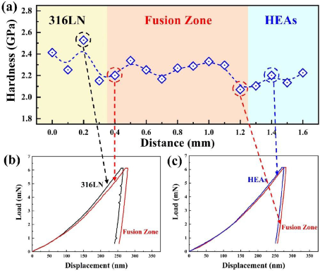 图 6 纳米压痕结果:(a)焊接接头的硬度分布,(b)和(c)两侧熔合线附近的典型载荷 - 位移曲线。