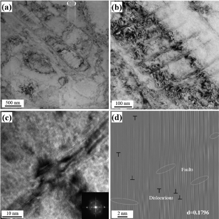 图 8 室温下断裂区域附近变形子结构的TEM图像:(a)变形子结构的形成,(b)图8(a)放大视图中变形子结构的细节,(c)从变形带(带有FFT图案插图)获取的HRTEM图像,(d)图8(c)的反快速傅里叶变换(IFFT)。
