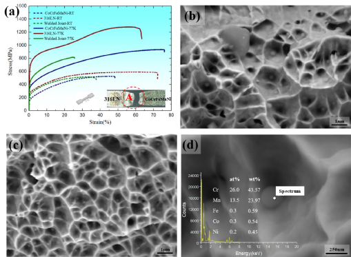 图 5 焊接接头的拉伸性能:(a)室温和77K处的应力-应变曲线,(b)室温下断裂面的SEM图像,(c)77K处断裂表面的SEM图像,(d)颗粒的EDS分析。