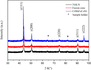 图 3 XRD数据显示了焊接接头中316LN、熔合区和高熵合金的图案。