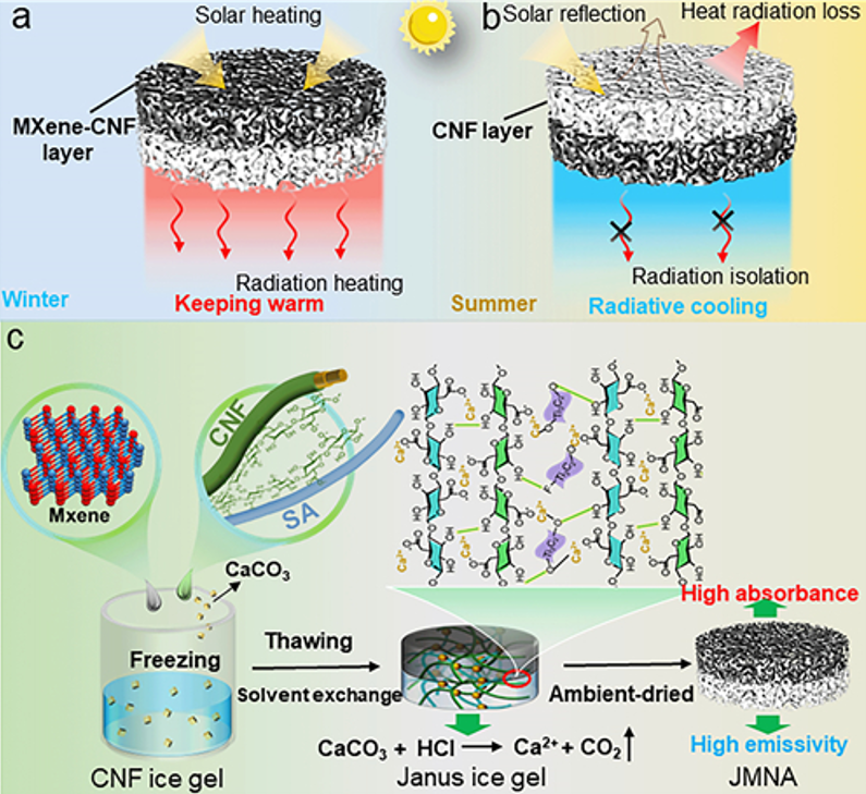 之前的工作中,已经通过反向聚合在织物表面设计了由聚吡咯和全氟十二烷基三乙氧基硅烷组成的超疏水仿生类黑素体分级纳米球织物,实现了人体热管理温度调节和光热蒸发应用(Nano Lett. 2022, 22, 9343-9350)。但是在材料稳定性和季节适应性温度调节方面仍有不足。基于此,中国科学院宁波材料技术与工程研究所智能高分子材料团队陈涛研究员、肖鹏副研究员通过免冻干的方法,设计了由光热MXene-CNF层和CNF层组成的Janus结构气凝胶(JMNA),该气凝胶能够实现可切换的热调节,将被动辐射冷却和加热集成到一个材料系统中,以适应多变的环境。