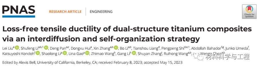 本项工作证明了将增强相非均匀构型和基体晶区异质结构有机结合的设计对实现钛基复合材料强度和塑韧性协同匹配具有重要的理论意义和应用价值。文章报告了一种基于粉末冶金法通过合金元素互扩散和增强相自组织过程实现增强相呈三维球团非均匀构型的创新设计和制备策略。通过该策略,可在增强相和基体之间原位构建出具有两级晶粒结构的新型双结构钛基复合材料,可充分发挥复合材料在变形阶段的异变诱导硬化和裂纹钝化效应,实现均匀构型钛基复合材料中几乎无法实现的强度–塑韧性的协同匹配。研究结果为解决金属基复合材料强度和塑韧性倒置严重的难题提供了一种创新性解决方案。该方案有望广泛应用于其他金属材料和金属基复合材料在结构和功能性提升需求的设计和开发。