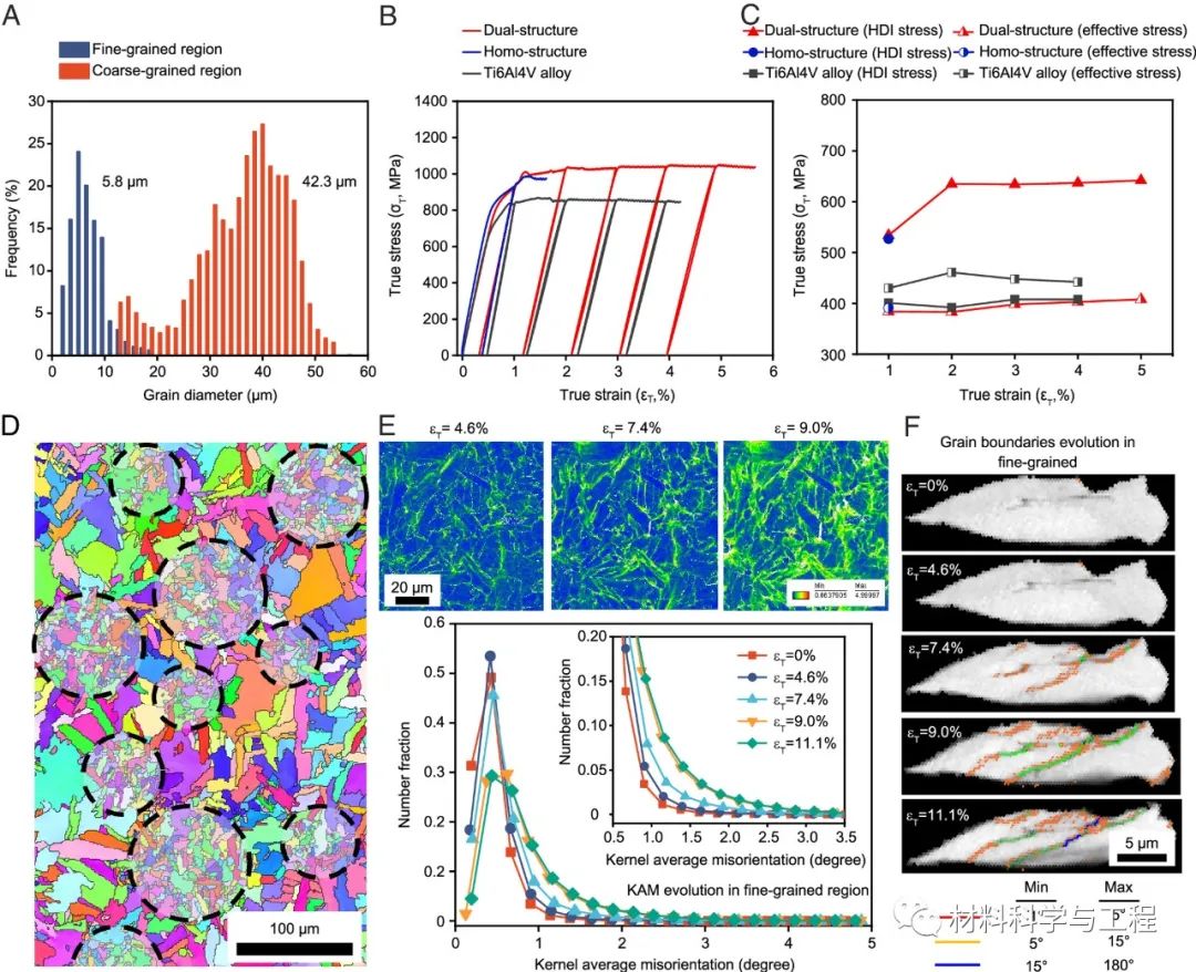 然而,目前增强相非均匀构型中界面结构多以单一异质界面为特点,并未从根本上改变陶瓷增强相与金属基体弹性模量的显著差异,使得即使在小变形量下,界面附近也会产生显著的应力集中,导致增强相及其界面容易成为裂纹源,不利于位错的钉扎和存储,从而削弱了材料的应变硬化能力。根据最新研究报道,在金属及合金材料中通过构建晶粒尺寸不同的基体晶区以形成基体晶区异构,利用粗/细晶间彼此塑性变形能力的差异激活异质变形诱导(HDI)硬化,是解决金属材料应变硬化能力不足,改善其强韧性倒置问题的有效措施。如能在MMCs设计中将增强相非均匀构型与基体晶区异构相结合,从而在增强相和基体塑性变形区之间形成有效的缓冲层,则有望在异质界面处激活HDI应力,为HDI硬化效应的发挥提供有利条件。理论上,现有MMCs的构型设计中在一定程度上也具有基体晶区异构的特征,但受非均匀构型制备工艺及其构型合理化程度的限制,基体晶区异构的特征并不显著,导致HDI硬化作用得不到有效发挥,从而使其对MMCs的应变硬化能力提升贡献极为有限。