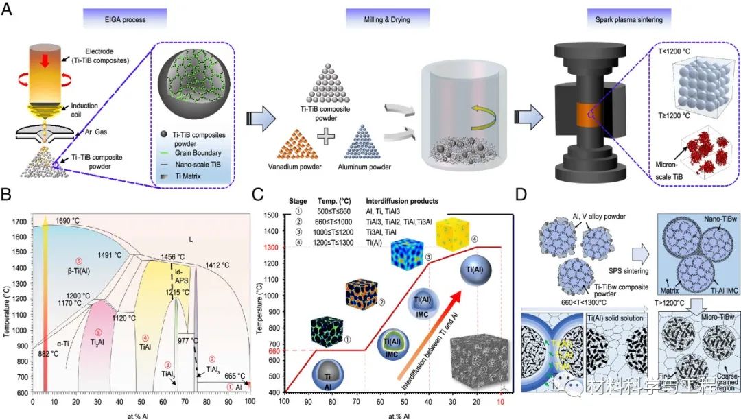 图3. 基于互扩散自组织策略制备双结构TC4-TiBw复合材料的工艺示意图及设计概念。