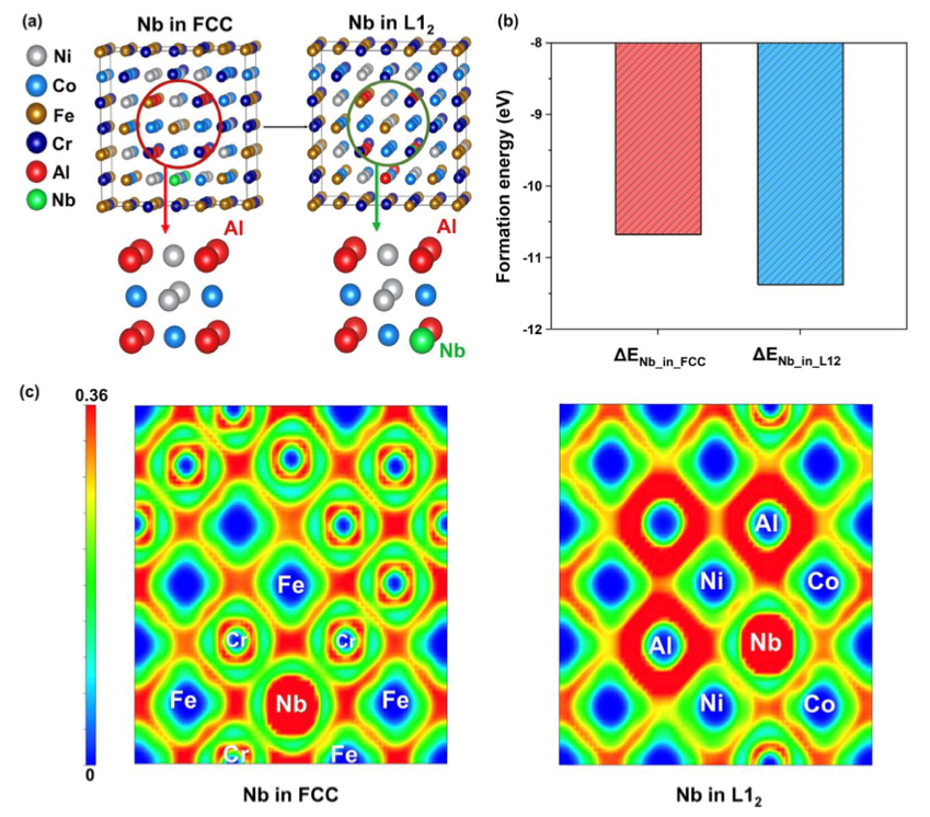 图7所示。第一性原理计算:(a)超级单体模型,(b)计算形成的能量图,(c) FCC和L12晶格中含Nb结构的ELF图。