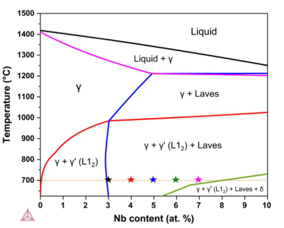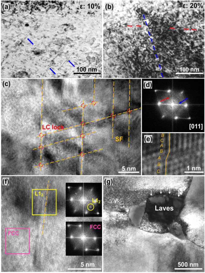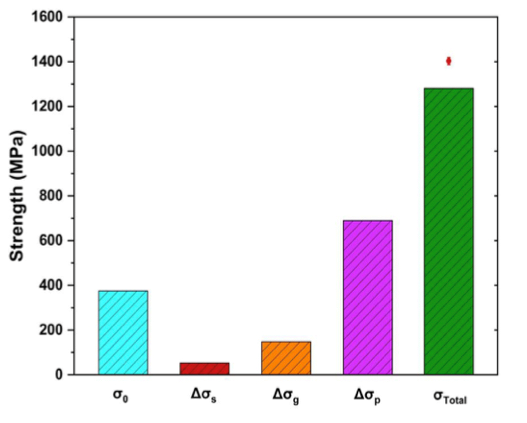 图9计算了5Nb HEA在24h时效条件下的固溶强化、晶界强化、L12和Laves相析出强化和总屈折强度的贡献。红点表示合金的实验屈折强度。综上所述,通过L12相和Laves相通过双析,制备出了一类具有高强度-塑性协同作用的新型HEAs,并且本文对合金的析出相组织、力学性能和变形行为进行了深入研究。得出以下结论。(1)第一性原理计算表明,Nb优先分配到L12纳米颗粒上,增强了L12相的稳定性。(2)L12纳米颗粒和Laves相双析出强化5Nb合金的屈服强度超过1400 MPa,极限抗拉强度超过1800 MPa,均匀伸长率达到18%,实现了高强度和延性的良好结合。强化模型表明,L12析出强化对5Nb合金屈服强度的提高起主要作用,L12析出强化、Laves强化、晶界强化和固溶强化共同作用使5Nb合金屈折强度达到1400 MPa以上。(3) 5Nb合金具有良好的延展性是由于其高了其硬化能力。(4) L12析出相被剪切,有利于位错在基体中长距离滑动。另一方面,位错堆积在Laves析出相和基体之间的界面上,这增加了塑性变形早期的加工硬化能力,但导致应力集中。