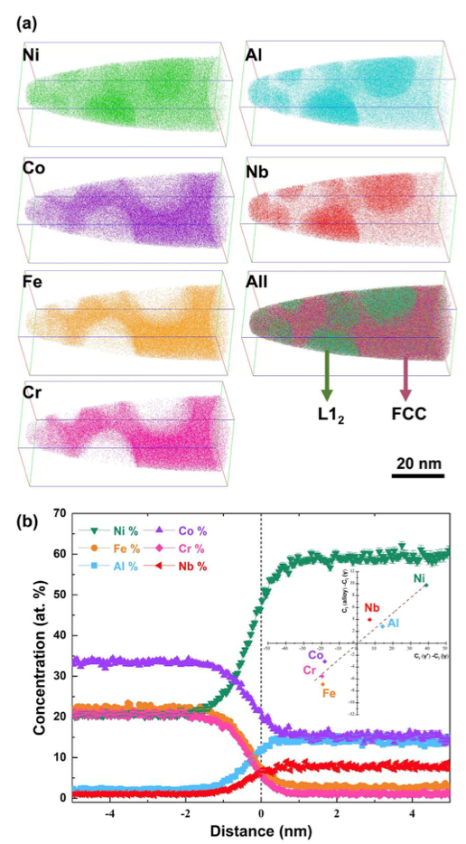 图 6 5Nb合金在700℃时效24 h后的APT表征:(a)原子图和(b)接近直方图浓度分布图。(b)的插图是使用杠杆法则计算L12相的体积分数。