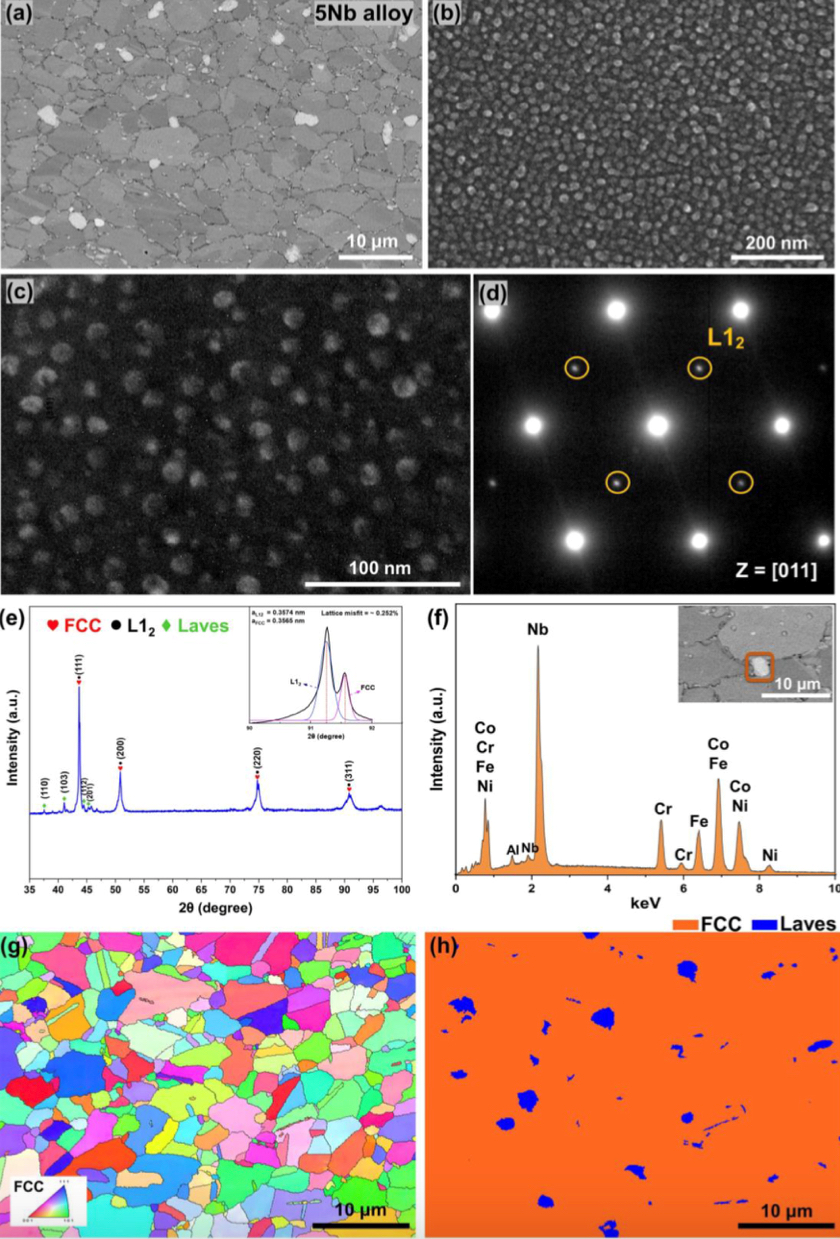 图 5 5Nb合金700℃时效24 h后的显微组织:(a) SEM图,(b)高倍SEM图,(C)暗场TEM图,(d) SAED图,(e) XRD图,(f)插片亮对比区域的EDS谱图,(g)和(h)分别为EBSD IPF图和相图。(e)的插入是(311)衍射峰的反褶积。