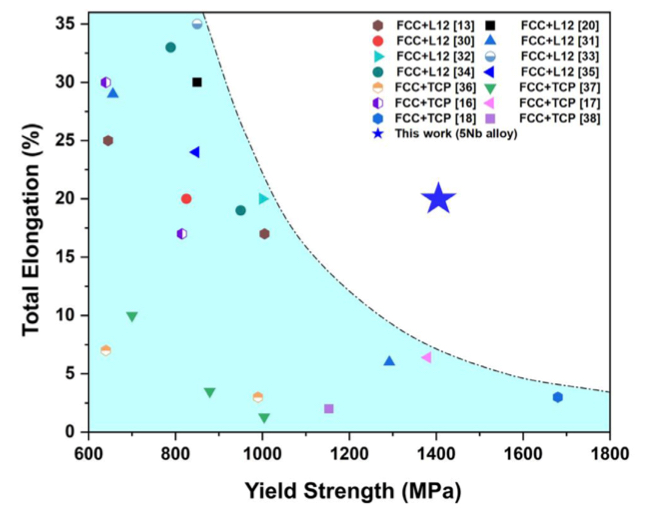 图 4所示。5Nb合金与不同类型析出强化HEAs的屈折强度与总伸长率的比较