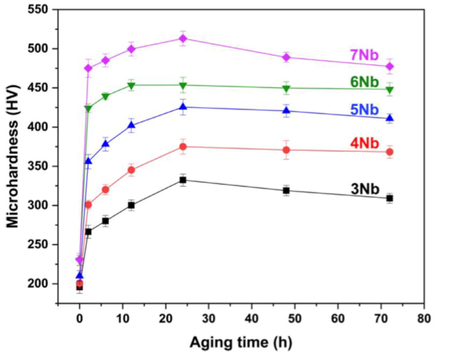 图2所示。在700℃下,3Nb、4Nb、5Nb、6Nb和7Nb合金的维氏显微硬度随时效时间的变化。