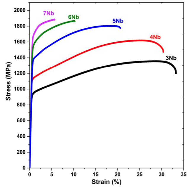 图3所示。3Nb、4Nb、5Nb、6Nb、7Nb合金在700℃时效24h后的拉伸工程应力-应变曲线