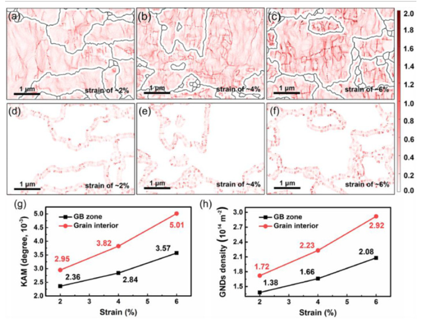 在渐进变形应变下Al-5CuO的(a)∼(c)晶粒内部和(d)∼(f)GB区的KAM图,即(a)和(d)∼2%,(b)和(e)∼4%,(c)和(f)∼6%,其中GB区的探测点被确定为距离GB小于100 nm。(g)和(h)显示了GB区的平均KAM和GND密度以及变形Al-5CuO的晶粒内部。