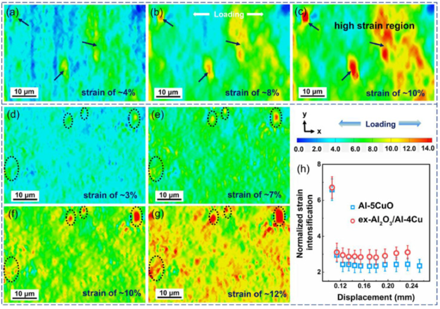 (a)∼(c) ex-Al2O3/Al-4Cu和(d)∼(g) Al-5CuO在原位拉伸变形过程中的应变演化.(h) 对归一化应变强度作为位移函数的定量分析。沿加载方向选择应变张量分量作为标称应变。