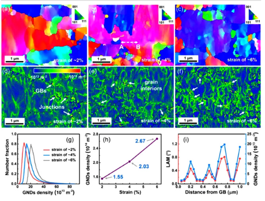 在渐进变形应变下Al-5CuO变形微观结构的t-EBSD表征,即(a)和(d)∼2%;(b) 和 (e) ∼4%;(c)和(f)∼6%。(a)* (c) 方位图;(d)∼(f) GND分布图。(g)变形Al-5CuO的GND密度分布和(h)整体GND密度。(i) GND 密度和 LAM 角,表示 (b) 中 A (GB) 和 B(内部颗粒)之间所有最近邻对的平均取向误差。