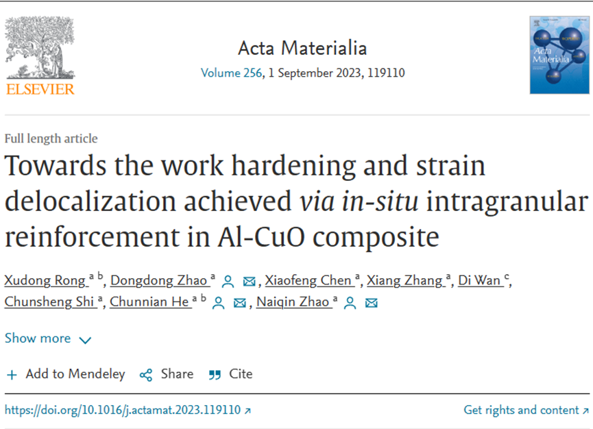 相关研究成果以题“Towards the work hardening and strain delocalization achieved via in-situ intragranular reinforcement in Al-CuO composite”发表在国际期刊Acta Materialia上。