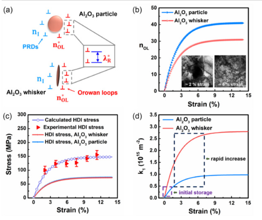 分别表示 Al2O3 附近的 PRD 数量、最大奥罗旺环数和相邻奥罗旺环之间的最小间距。(b) Al2O3晶须和颗粒处储存的Orowan环数与应变的预测依赖性。(c)计算出Al2O3晶须和颗粒对Al-5CuO运动硬化与应变的各自和全部贡献,其中包括实验HDI应力进行比较。(d) Al2O3诱导的珠三角贮存速率与菌株的预测依赖性。