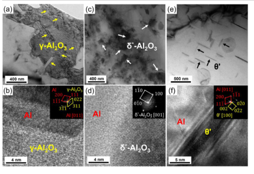 典型的TEM图像显示了Al-5CuO复合材料的微观结构。(a)γ-Al2O3晶须、(c)δ*-Al2O3颗粒和(e)θ'的分布特征;HRTEM图像显示了(b)Al和γ-Al2O3晶须,(d)Al和δ*-Al2O3颗粒,(f)Al和θ'之间的界面。
