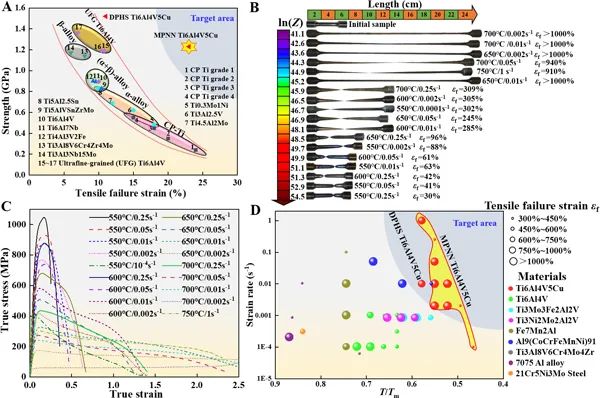 图1. 多相纳米网状超塑性钛合金的组织设计、制备与表征。(A)组织设计思路。(B)材料制备流程。(C)初始态组织的EBSD表征结果。(D)初始态组织的高分辨TEM观察。