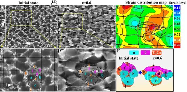为解决上述问题,中科院金属研究所杨柯、任玲研究团队与澳大利亚皇家墨尔本理工大学邱冬教授研究团队合作,在前期开发的高性能双相核壳纳米结构Ti6Al4V5Cu合金基础之上(Nature Communications, 2022, https://doi.org/10.1038/s41467-022-29782-8),设计并制备了具有多相纳米网状结构的新型钛合金(图1),它利用基体中的纳米β网促进微纳米晶晶粒间的滑移与倾转,并利用沿