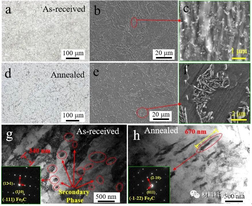 图1 E690钢两种实验的微观组织形态:a、d立体显微形态;b、c、e、f SEM图像;g、h TEM图像;a、b、c、g原始钢;d、e、f、h退火钢