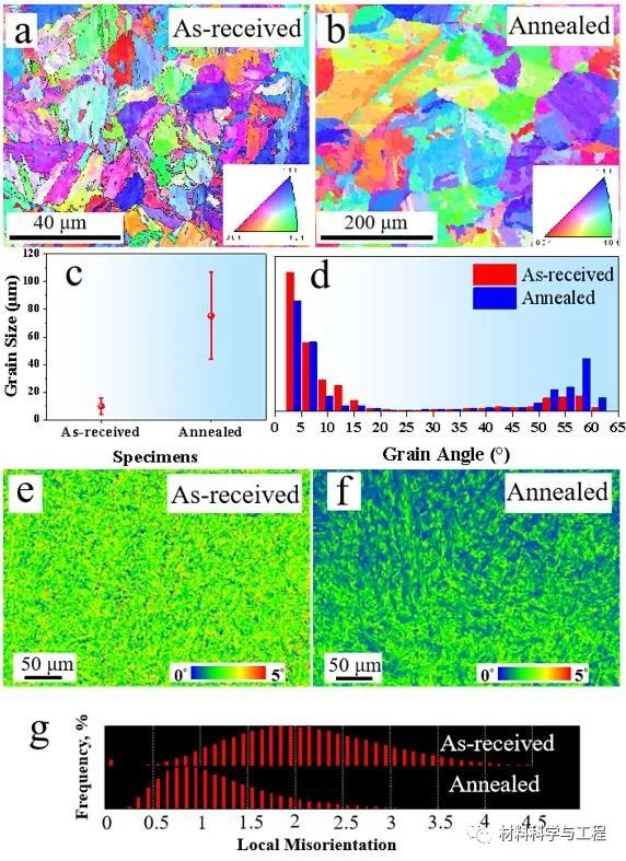 图2 反极图、晶粒取向和核平均取向差图比较:a、b反极图;c晶粒尺寸分布;d取向差角分布;e、f核平均取向差的颜色编码映射,以及g 原始和退火E690钢的局部取向差分布;
