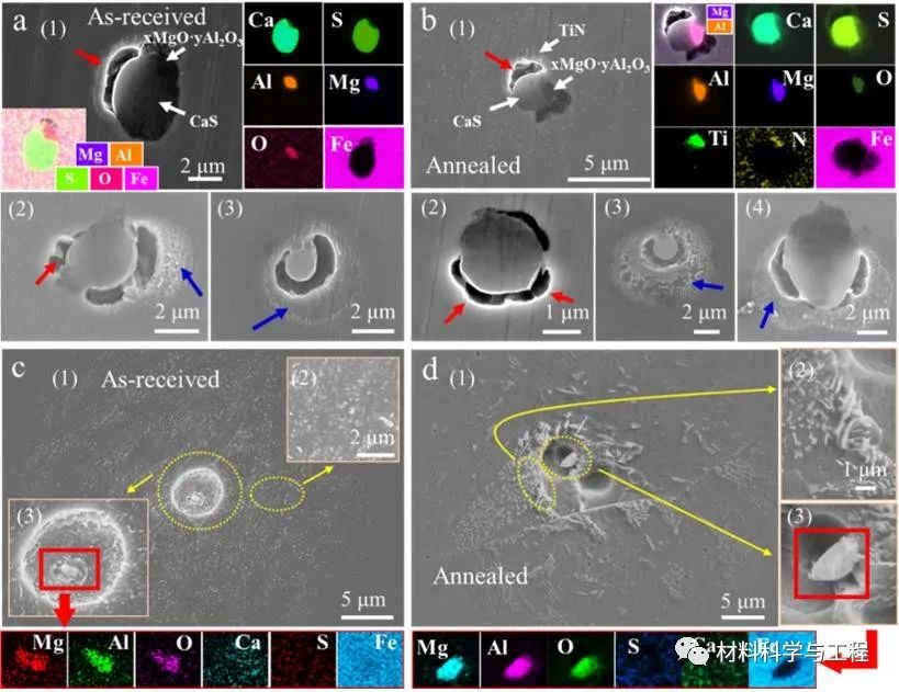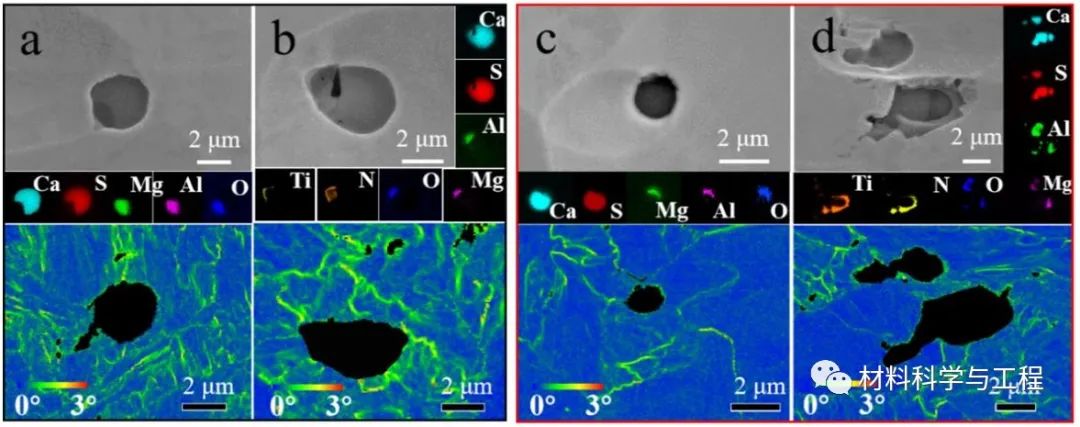 图3 二次电子显微镜图像、EDS图谱和EBSD结果:CaS·xMgO·yAl2O3夹杂物和(b,d)CaS·xMgO·yAl2O3·TiN夹杂物。a、b原始样品;c、d退火样品;