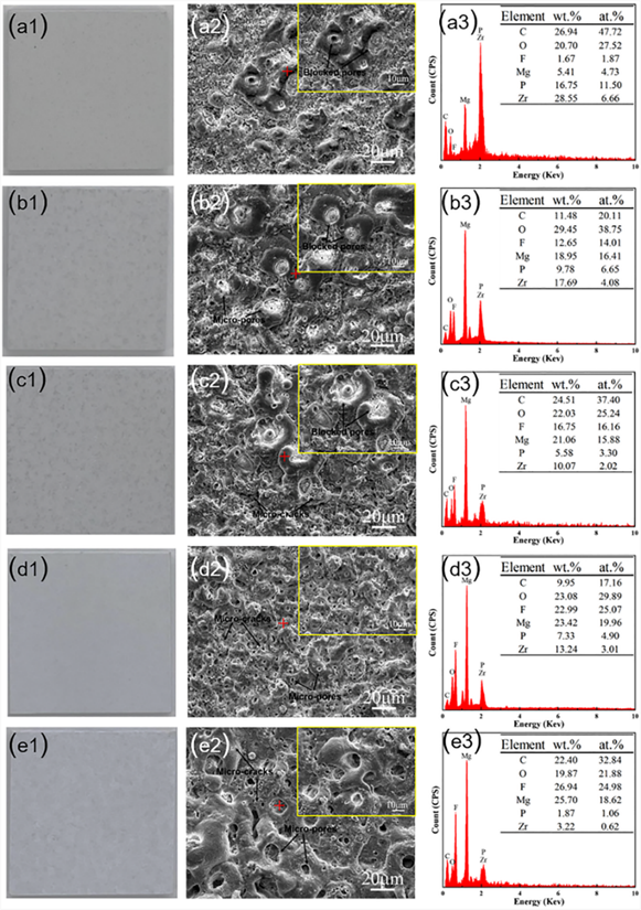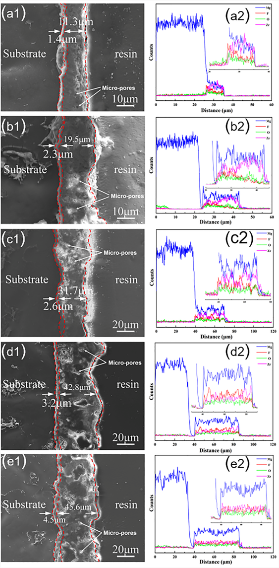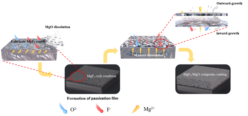 北京石油化工学院陈飞教授团队—表面工程及材料腐蚀与防护课题组在镁合金(AZ91D)表层改性领域取得最新研究进展。镁合金具有密度小、比强度高、抗冲击能力强以及生物兼容性良好等特点,因此被广泛的应用在化工、航空航天、医疗材料电子产品等各个领域,中国制造2025战略规划提出了"创新驱动、质量为先、绿色发展、结构优化、人才为本、协同创新"六大原则,通过大力推动信息技术、机器人、新材料等新兴产业的发展,推动制造业转型升级,提高制造业的质量和效益,因此合理高效运用镁资源对我国具有重要意义。然而镁合金工件暴露在大气中时可能会面临腐蚀介质的侵蚀,如镁合金制成的汽车车身、飞机零部件、电脑外壳、水处理设备、运动器材、医疗器械等,腐蚀介质对镁合金的表面会产生腐蚀,导致镁合金的性能下降、失效或损坏。因此需对镁合金进行表面处理,提高其在腐蚀介质中的耐蚀性,以保证镁合金工件在腐蚀介质中能够长期服役。 微弧氧化( MAO)是一种将铝、镁、钛等阀金属置于特定的电解液中,利用微区瞬间高温烧结作用,在其表面原位生长陶瓷层的表面处理技术。然而,经MAO处理后的膜层存在大量的微孔及微裂纹,腐蚀性离子很容易通过微孔或裂纹的缝隙渗透到膜层的内部甚至基体中,进而导致氧化膜发生腐蚀,尤其是在酸性腐蚀介质中,传统以氧化镁为主要耐蚀性物相的膜层更容易因氧化镁水解而失效。因此,要进一步增强镁合金表面MAO膜层的耐蚀性,提高镁合金工件的使用寿命,对微弧氧化技术的工艺进行改良是十分必要的。 传统微弧氧化电解液体系主要有硅酸盐、铝酸盐、磷酸盐,镁合金在这三种碱性电解液中能够顺利生成钝化膜,从而微弧氧化生成主要耐蚀性物相为氧化镁的膜层,但是氧化镁对于提升镁合金的耐蚀性有限;氟化镁是一种难溶于水和醇,微溶于稀酸的惰性化合物。本研究使用螯合剂辅助法促使镁合金在酸性电解液中产生缓蚀行为,从而顺利生成钝化膜进而起弧,进一步的系统研究NaF浓度对于膜结构和性能的影响。研究成果以“Influence of sodium fluoride in acidic electrolytic solution on the structure and properties of plasma electrolytic oxidation coating on AZ91D magnesium alloy.”为题,发表在Journal of Materials Science期刊上,第一作者为荣志伟(在读硕士研究生,北京石油化工学院),通讯作者为陈飞(教授,北京石油化工学院)。 Citation: Rong, Z., Bai, Y., Tian, H. et al. Influence of sodium fluoride in acidic electrolytic solution on the structure and properties of plasma electrolytic oxidation coating on AZ91D magnesium alloy. J Mater Sci 58, 8103–8117 (2023). https://doi.org/10.1007s10853-023-08469-5. 研究成果